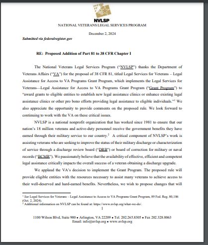 NVLSP recently submitted comments in support of VA’s proposal to create a new grant program that would fund organizations assisting veterans with discharge upgrade applications. NVLSP’s comments supported the creation of this new program and encouraged VA to broaden the scope of legal services contemplated by the program and amend its criteria for receiving assistance under the program to account for pro bono programs and programs that operate fully remotely.