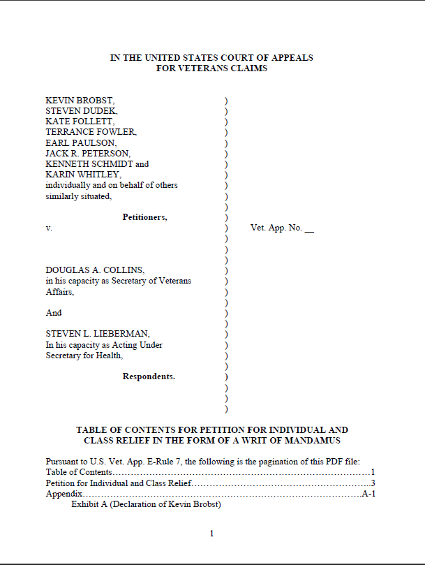 ARLINGTON, VA — Yesterday, the National Veterans Legal Services Program (NVLSP) filed a class action petition with the U.S. Court of Appeals for Veterans Claims (CAVC) on behalf of eight veterans– Kevin Brobst, Steve Dudek, Kate Follett, Terrance Fowler, Earl Paulson, Jack Peterson, Kenneth Schmidt, Karin Whitley and an unknown number of other of veterans who tried to apply pursuant to a 2023 regulation of the Department of Veterans Affairs (VA) giving veterans who experienced medical emergencies occurring as far back as 2010 a unique one-year period to obtain reimbursement of the emergency medical expenses they incurred years ago at non-VA facilities.